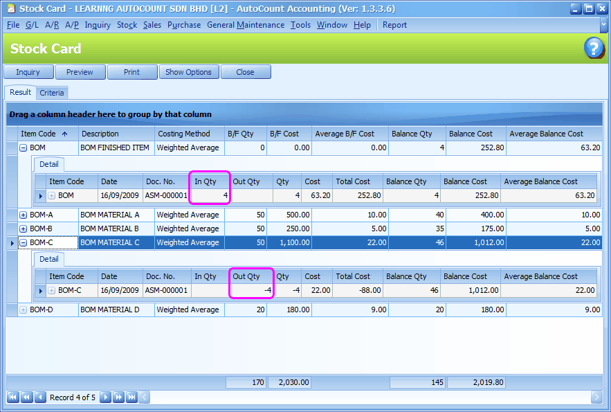 Note: you may see that the balance quantity of material (BOM-C) and finished goods (BOM) were affected accordingly.