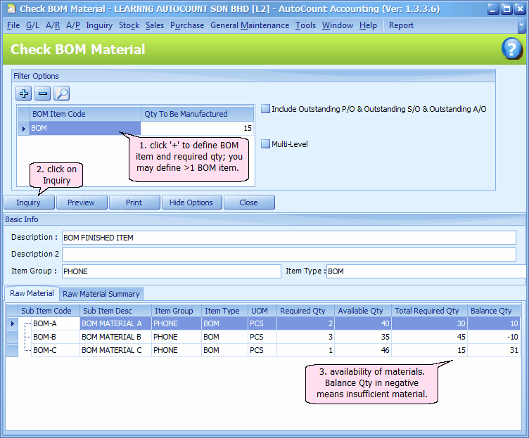First of all, maintain stock items for BOM finished goods and materials, then key in their opening balances OR create purchase documents (if any). In the following example, 'BOM FINISHED ITEM' is a finished goods, and its materials are: BOM-A, BOM-B, and BOM-C.
