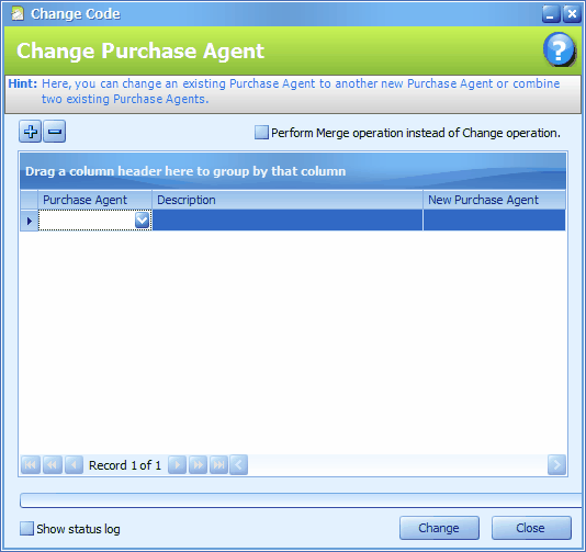 To Merge Purchase Agent: Check the checkbox of Perform Merge operation instead of Change operation. Click on '+' sign to select an existing Purchase Agent code (that you wish to remove), Key into New Purchase Agent code field an existing Purchase Agent code (that you wish to merge to) Click on Change.