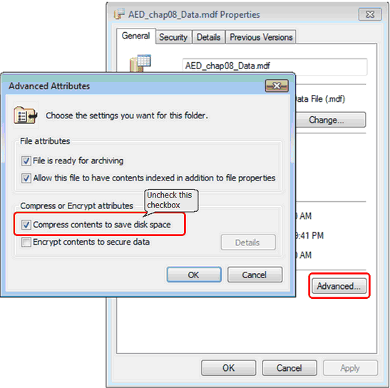 Click on Advanced, uncheck the checkbox of Compress contents to save disk space. OK, OK. .. you may need to wait for few seconds to see the database filename changed to normal color (black)…