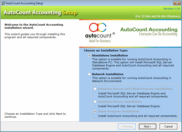 Standalone Installation: for standalone, the setup will install both Database Engine (if you have not installed Microsoft SQL Server) and AutoCount Accounting onto your PC. Just click on Next to proceed.