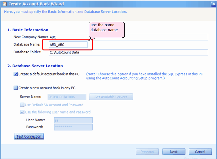 3. Create new account book using the same database file name as the suspected database (e.g. AED_ABC)